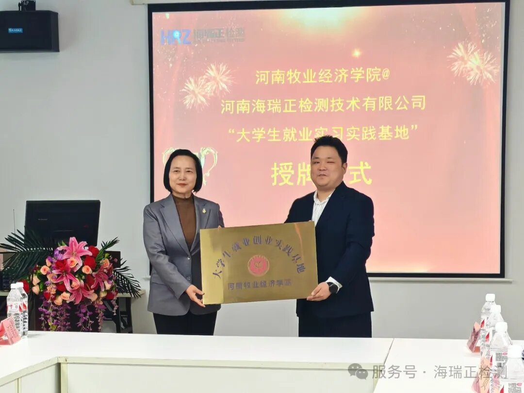 為進一步推動合作落地,尹新明校長代表學校向海瑞正檢測授予“大學生就業(yè)實習實踐基地”和“百名專家助百企工程服務基地”牌匾。